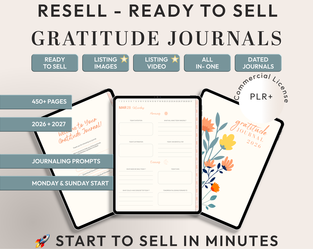 PLR Digital Products | Ready to Sell 2026 + 2027 Premium Digital Gratitude Journal with Resell Rights | Pack with Listing Materials Included