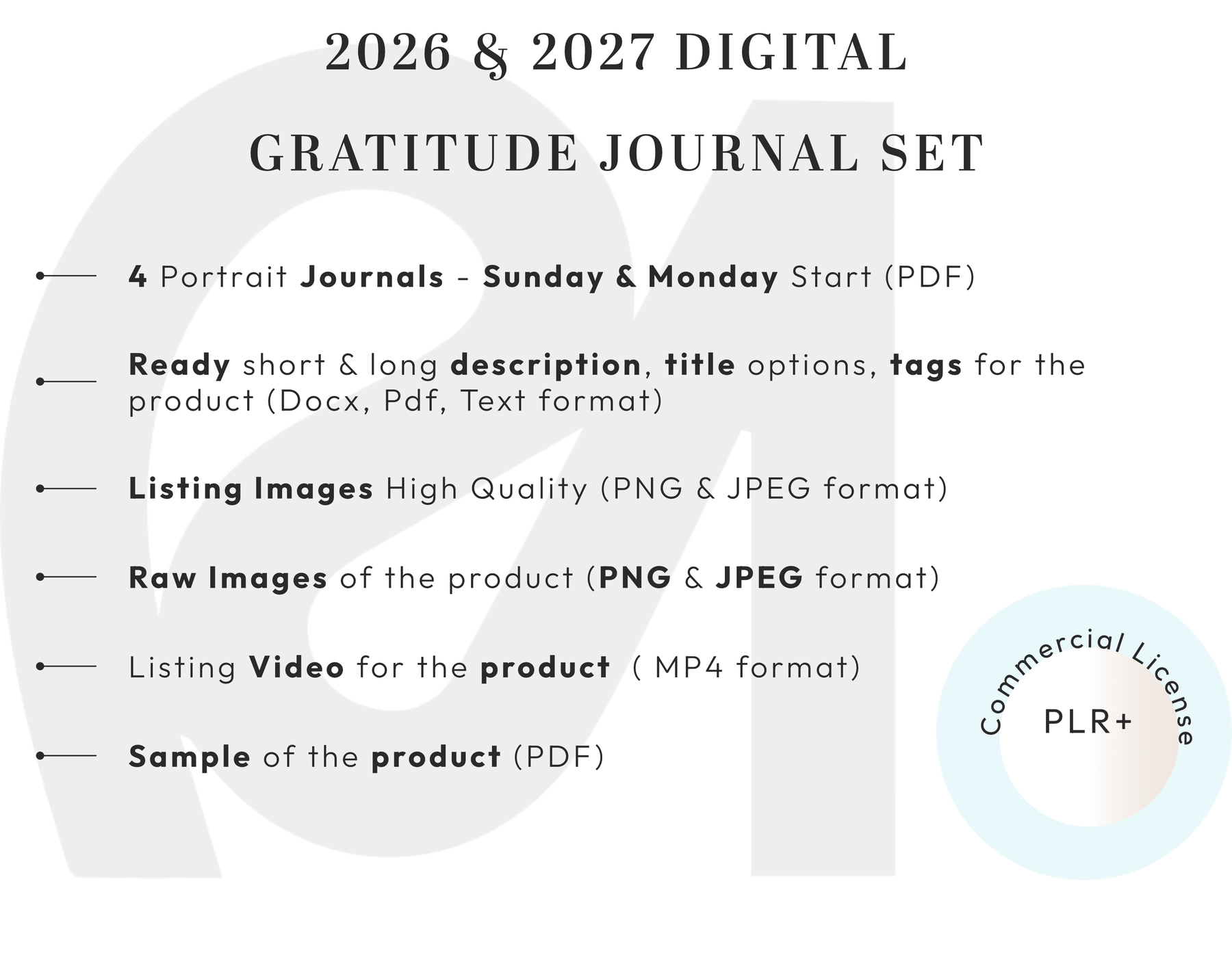 PLR Digital Products | Ready to Sell 2026 + 2027 Premium Digital Gratitude Journal with Resell Rights | Pack with Listing Materials Included